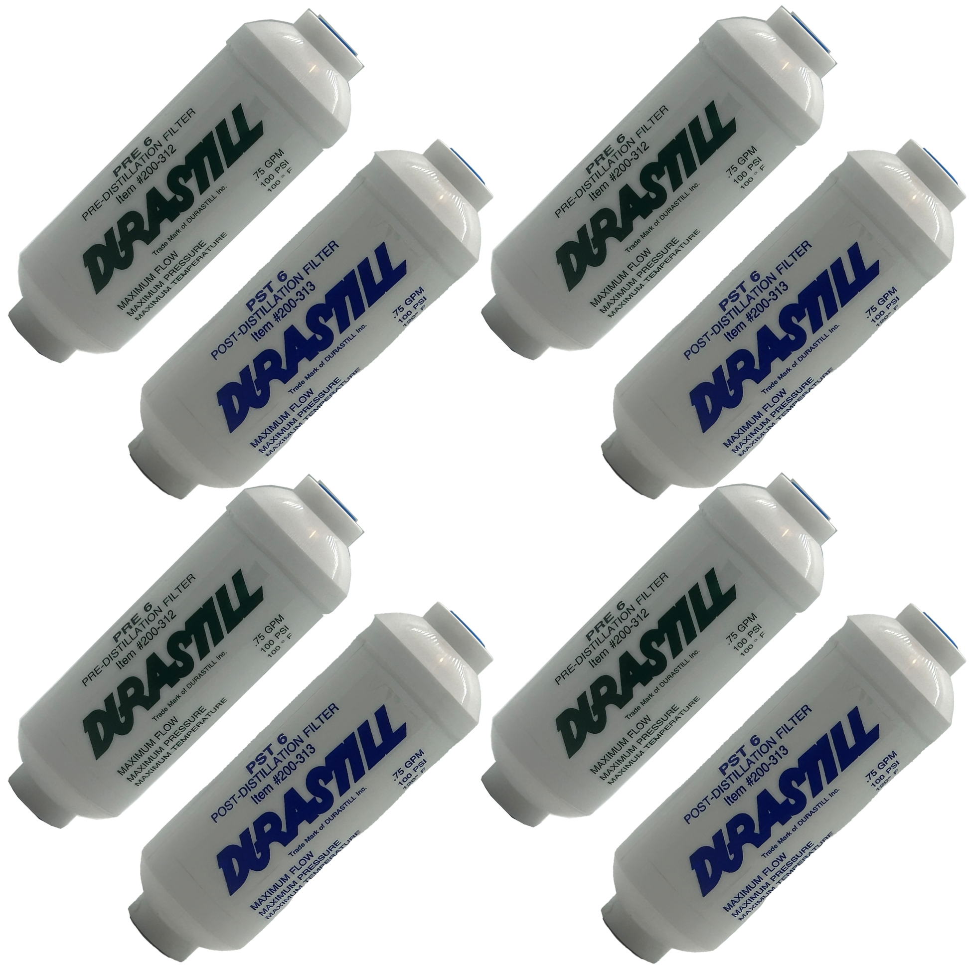 Durastill 8 Filter Mega-Pack includes 4 Pre-Filters #200-312 and 4 Post-Filters #200-313 for All Durastill Water Distillers. Free Continental USA SHIPPING (48 States)