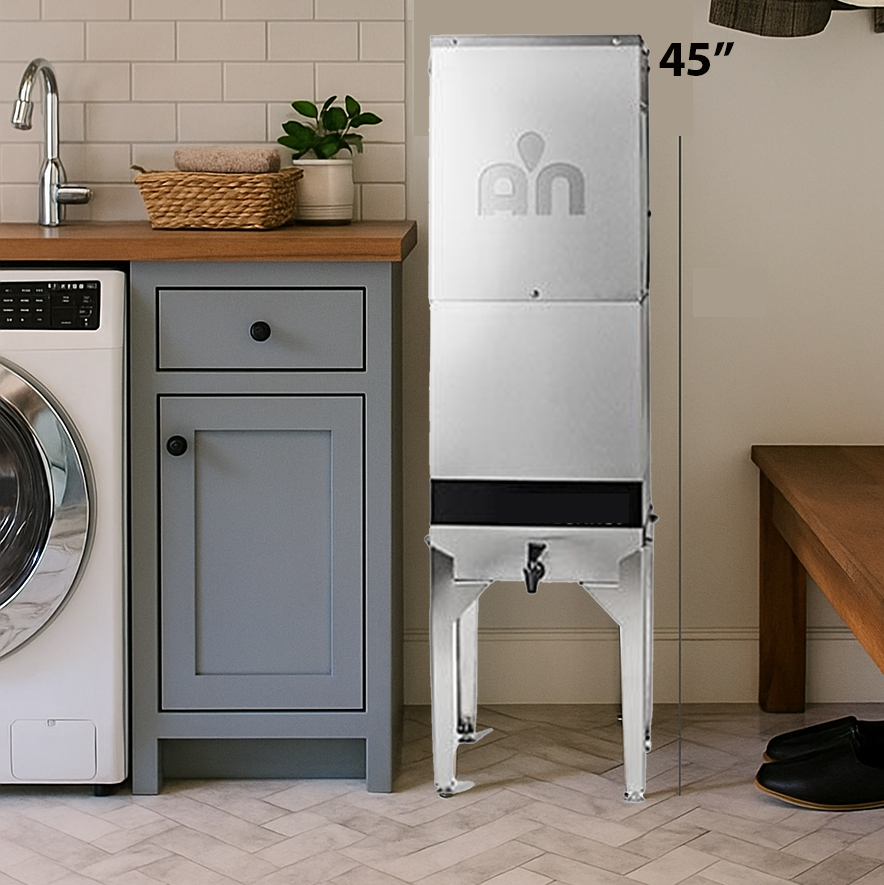 The WDAN1010 Water Distiller from USA Water Distillers delivers a reliable supply of high-purity distilled water, producing up to 10 gallons per day. Built with durable 304-grade stainless steel, it includes a 10-gallon storage tank and a built-in faucet. The stand with adjustable leveling feet allows easy placement, and the unique steam sterilization feature ensures clean, safe water. Proudly made in the USA, the WDAN1010 is ideal for households seeking a green alternative to bottled water for drinking, cooking, ice, or CPAP machines. To Purchase The Distiller only without home convenience kit CLICK HERE